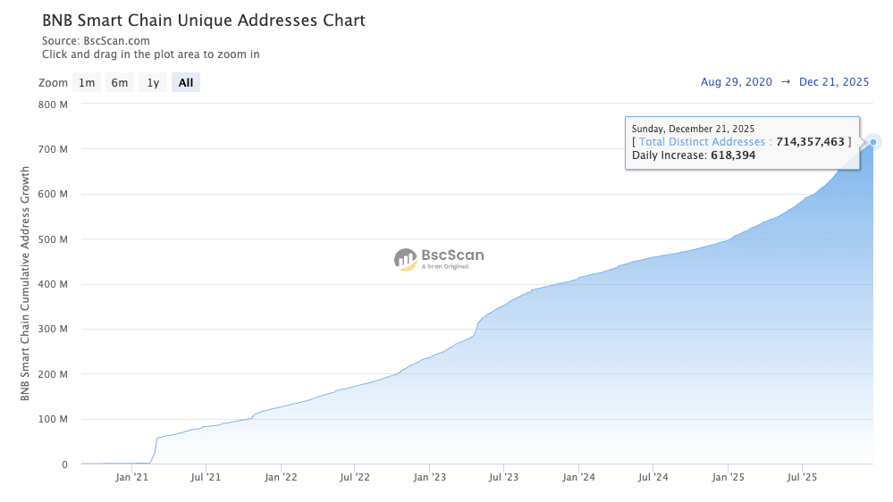 Total unique addresses exceeded 700 million, with both BSC and opBNB reaching new usage milestones with over 4 million daily active users.