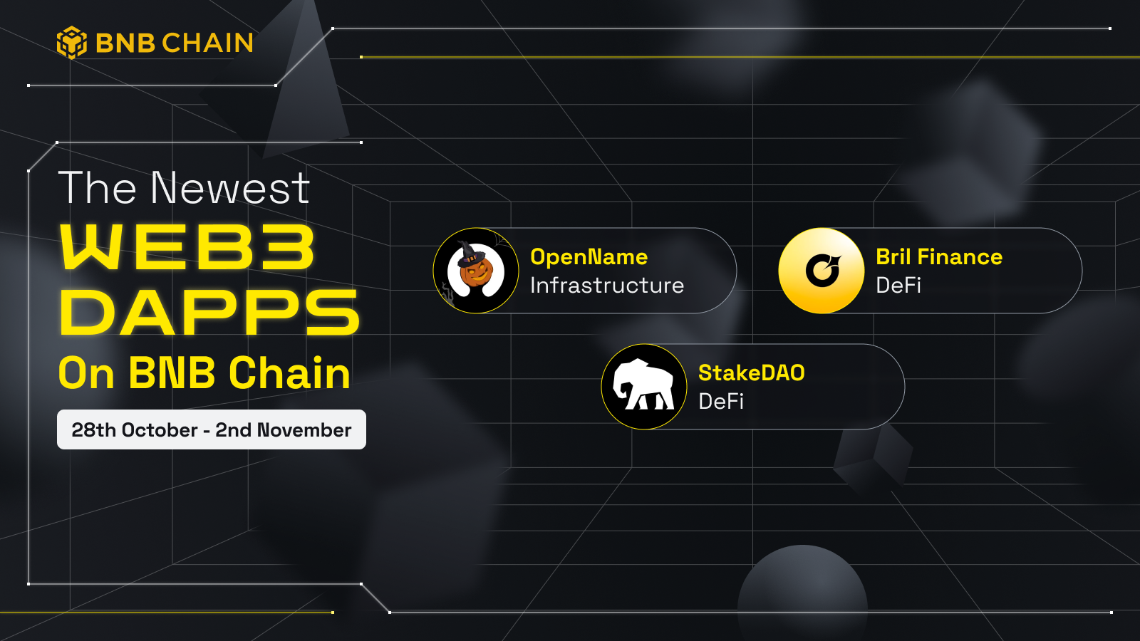 Each week, BNB Chain onboards tons of new projects across the landscape of DeFi, SocialFi, Web3 gaming, and beyond. Read our full blog for descriptions about each new project.