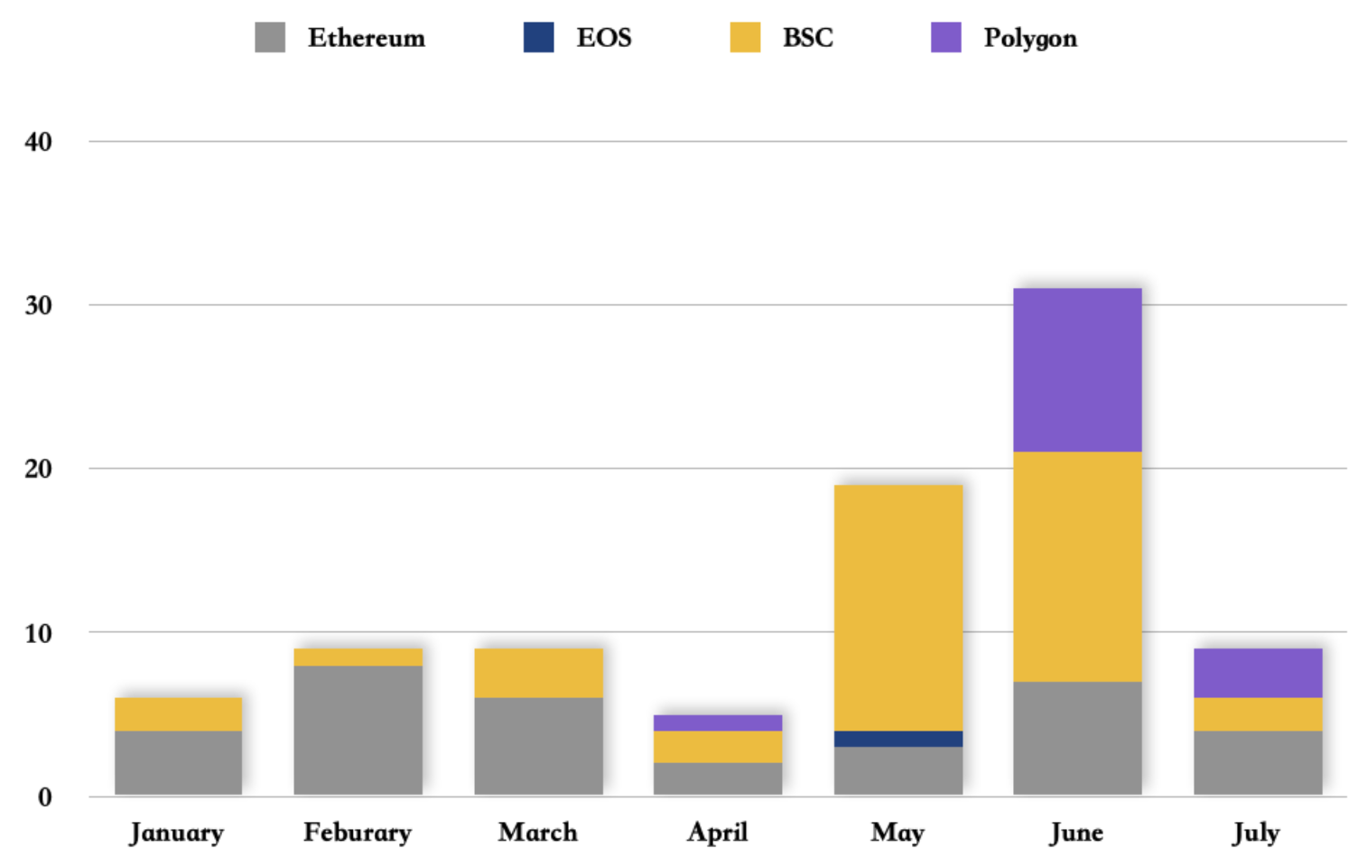 For example, nearly 66% of major fraud and misappropriations volume stemmed from DeFi protocols performing rug pulls in Q1 2021 on BSC; total, loss netted $94.3 million. After BSC’s TVL, liquidity, and daily transactions hit an all-time high, Logic error and Flash loan attacks dramatically increased in May.