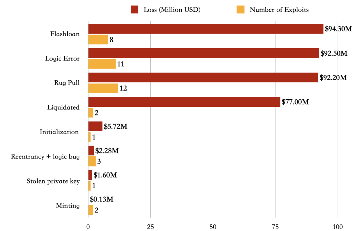 Regarding the attack techniques, we also found that Rug pulls have been on the rise since the early stage of blockchain development. Increasing volume attracts more malicious parties motivated by the increased incentives. This brought new challenges in the form of Logic errors and Flashloans.